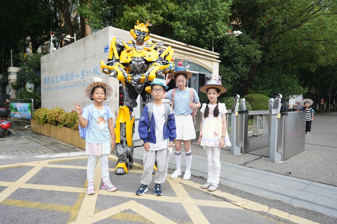 9 月 28 日,南京致远外小分校校园内科技氛围浓厚,以 “童心启慧行动・科创点亮未来” 为主题的第十一届科技节正式拉开帷幕,为师生们带来一场兼具趣味与深度的科创盛宴。清晨的校园门口,一抹亮眼的 “机甲身影” 格外引人注目 —— 刘方正老师身着 “大黄蜂” 装扮惊喜亮相。灵动的造型瞬间吸引了过往学生与家长的目光,大家纷纷驻足观望、拍照互动,原本宁静的校门口变