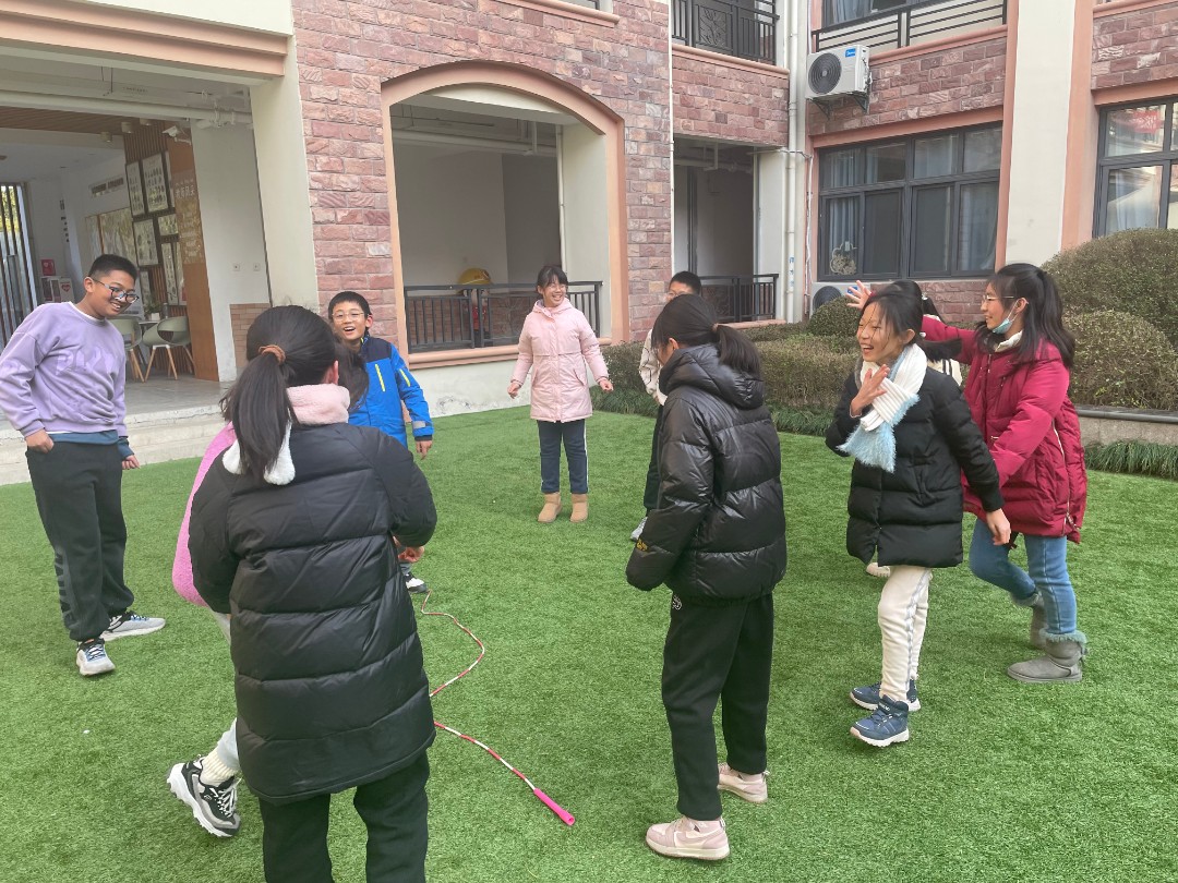 今天的大课间活动格外有趣。当大家跳了很久的长绳后,张凯程突发奇想:我们来玩圆心跳吧!同学们炸开了锅,什么是圆心跳呢?!怎么玩啊!快来试试吧!按照提醒,同学们围城一个圆圈,张参谋手握对折好的长绳,站在正中间。张参谋将长绳拖在地上甩起来,同学们逐个高高跳起。哦,原来是这样!渐渐的,长绳越升越高,大家跳起来的高度也随之增加!这可真是一个有创意的小活动!
