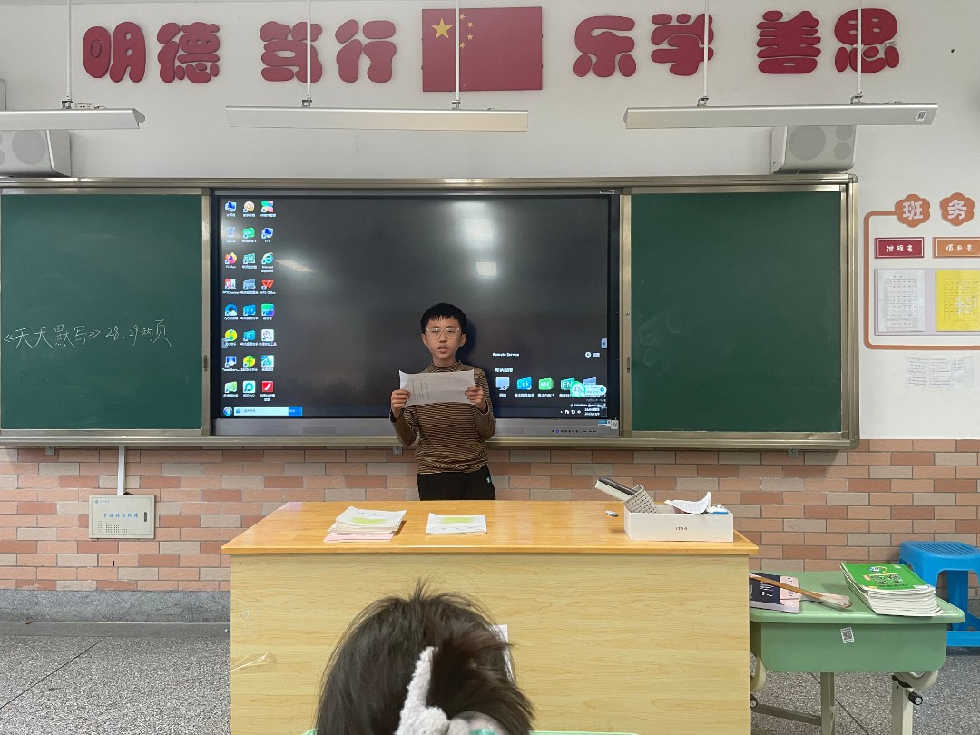 全班同学热情期待着班级展示的日子到来。前面一连几天大雪,开心之余,我们也格外期盼本周能有条件进行国旗下展示活动。为了这次活动,我们班级认真地进行练习,多次彩排。终于,我们在周四这天,整装待发,即将登台。王杰瑞、许悦萌和汪雨奇同学进行了《开对心窗,笑对生活》的主题演讲。在一扇窗户前,小女孩正泪流满面,原来那扇窗户外不远处就是那个埋葬她心爱的小狗的坟墓。此时,她