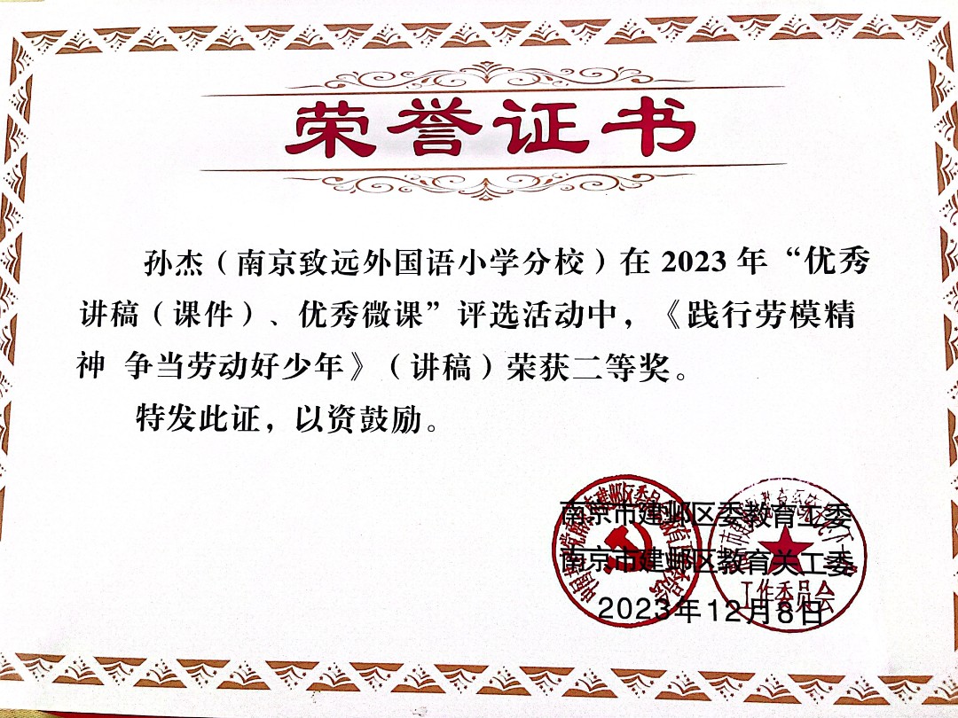 喜报!喜报!恭喜孙杰老师在2023年“优秀讲稿(课件)、优秀微课”评选活动中,《践行劳模精神 争当劳动好少年》(讲稿)荣获二等奖!