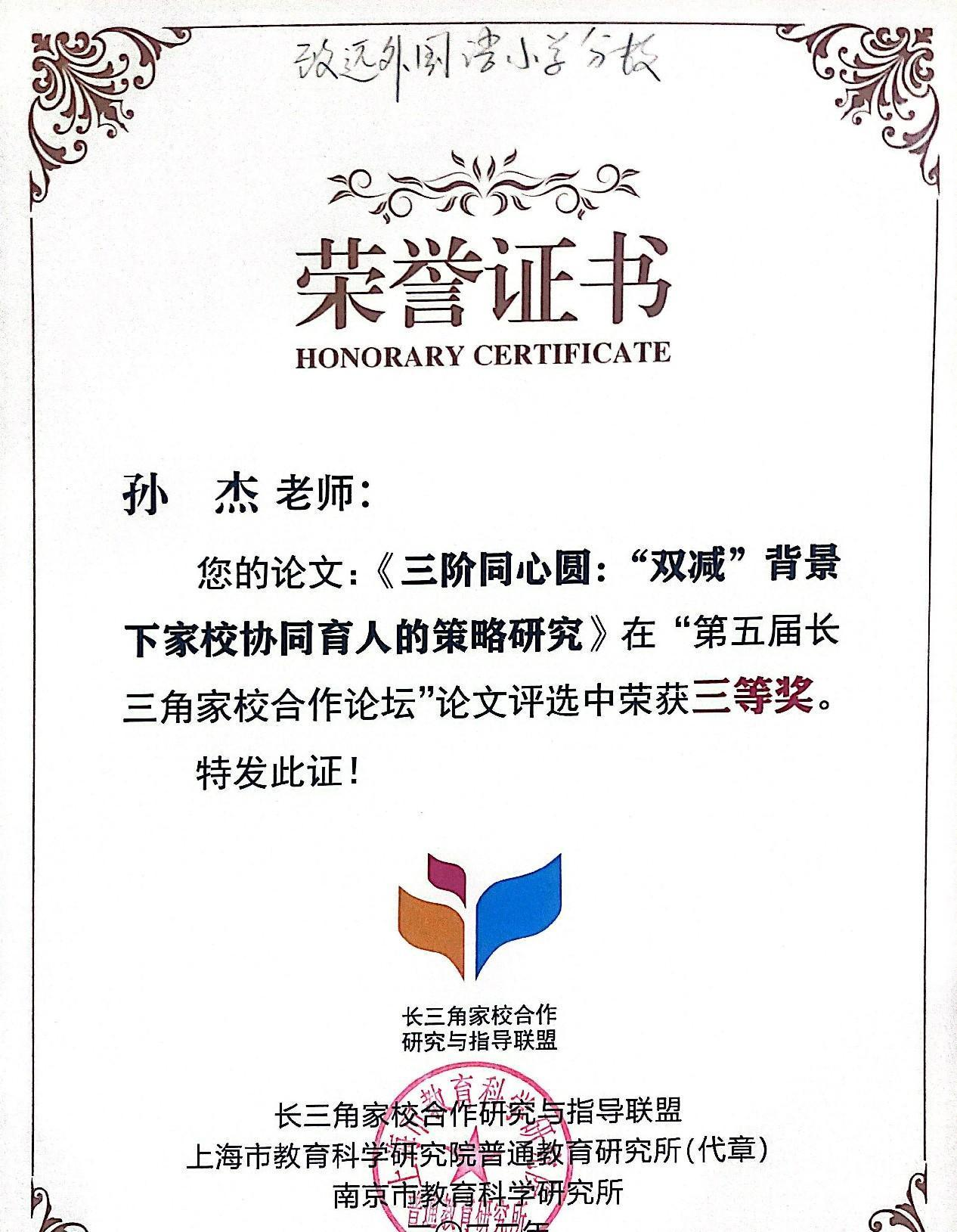 喜报!孙杰老师撰写的德育论文《三阶同心圆:“双减”背景下家校协同育人的策略研究》在“第五届家校合作论坛”论文评选中获三等奖。